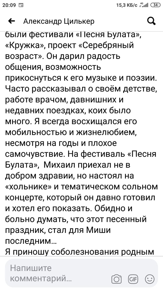 "ИХ ДОЛЖНО РЕЗАТЬ ИЛИ СТРИЧЬ" Не думал, что придётся ещё возвращаться к этой теме, вроде всем уже всё понятно. Но бессовестность некоторых товарищей заставляет написать этот пост. В пятницу от нас ушел Михаил Кукулевич. Коронавирус. В начале сентября он участвовал в "Песнях Булата". А 25 сентября его не стало. Казалось бы организаторы фестиваля должны осознать свою ответственность и сделать выводы. Однако в субботу Александр Цылькер вместо выражения соболезнований публикует приглашение на очередной фестиваль на той же площадке. После моего поста с указанием этой "неувязочки" Цылькер банит меня и таки публикует текст памяти Михаила Анатольевича (см. ниже) У него, оказывается, уже сутки ком в горле и слёзы наворачиваются (но сказать об этом раньше, до моего напоминания, он почему-то не смог, а новый фестиваль прорекламировать, это сколько угодно). И вообще, по его словам, Михаил Анатольевич приехал на фестиваль "не в добром здравии" (это, видимо, надо понимать как гипотезу Александра, будто Михаил Анатольевич заразился не на фестивале, а раньше). Что же делают организаторы фестиваля увидев человека "не в добром здравии"? Отправляют его быстрее домой, заботясь о его здоровье и обеспечивая безопасность других участников фестиваля? Нет! Устраивают ему "сольники и "хольники", очевидно подвергая зрителей (если принять гипотезу о уже развивающейся болезни) смертельной опасности. Какой из этого можно сделать вывод? Господину Цилькеру, на самом деле, глубоко плевать на участников и гостей проводимых им фестивалей. Помрут (из-за его безответственности, а может и сознательного наплевательства на все правила безопасности!) эти, он новых пригласит. Благо пока авторов и любителей песни предостаточно. Друзья, если вы собираетесь посещать мероприятия, связанные с этим человеком, имейте в виду, что вы для него лишь расходный материал. "Их должно резать или стричь". Вложение: