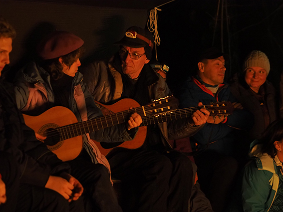 На данном выезде мы немножко прессуем опытных исполнителей, дабы не узурпировали гитару, чтобы пели все, по возможности. Круг идёт в формате «воля ваша»: хочешь – пой, хочешь – заказывай, хочешь – анекдот расскажи. В итоге получается интересно.
